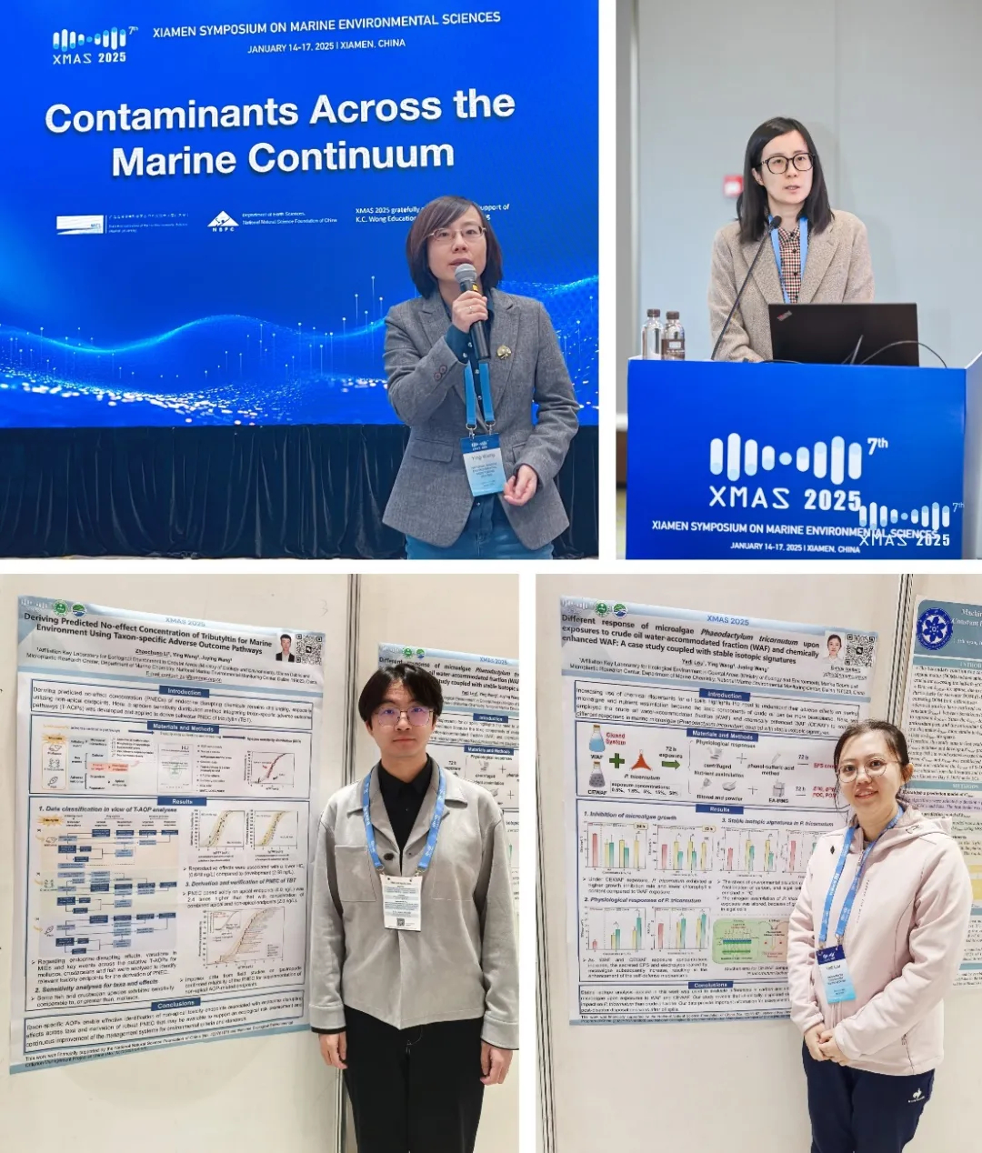 我中心王瑩研究員與中國科學院南海海洋研究所和廈門大學專家共同召集“海洋連續體中的污染物:行為、歸趨及生態風險評估”分會場。會上,叢藝副研究員以《海水中內分泌干擾物(EDCs)預測無效應濃度推導的SSD新方法》為題進行匯報,系統梳理了EDCs水質基準推導所面臨的挑戰以及以物種敏感度分布(SSD)模型為基礎理論的方法學發展趨勢。李昭川作了題為《基于有害結局路徑的我國三丁基錫海洋生物水質基準研究》的墻報展示,將有害結局路徑與SSD方法相結合,為新污染物海洋生物水質基準制定提供新思路和新方法。婁亞迪作了題為《三角褐指藻對原油水溶性組分與化學增強水溶性組分脅迫的響應差異:基于穩定同位素組成特征的研究》的墻報展示,闡明了化學分散劑作用下原油脅迫對三角褐指藻生長效應、生理響應及營養物吸收利用的影響,有助于揭示海洋溢油污染的長期不利影響,為溢油災后處置決策提供科學依據。